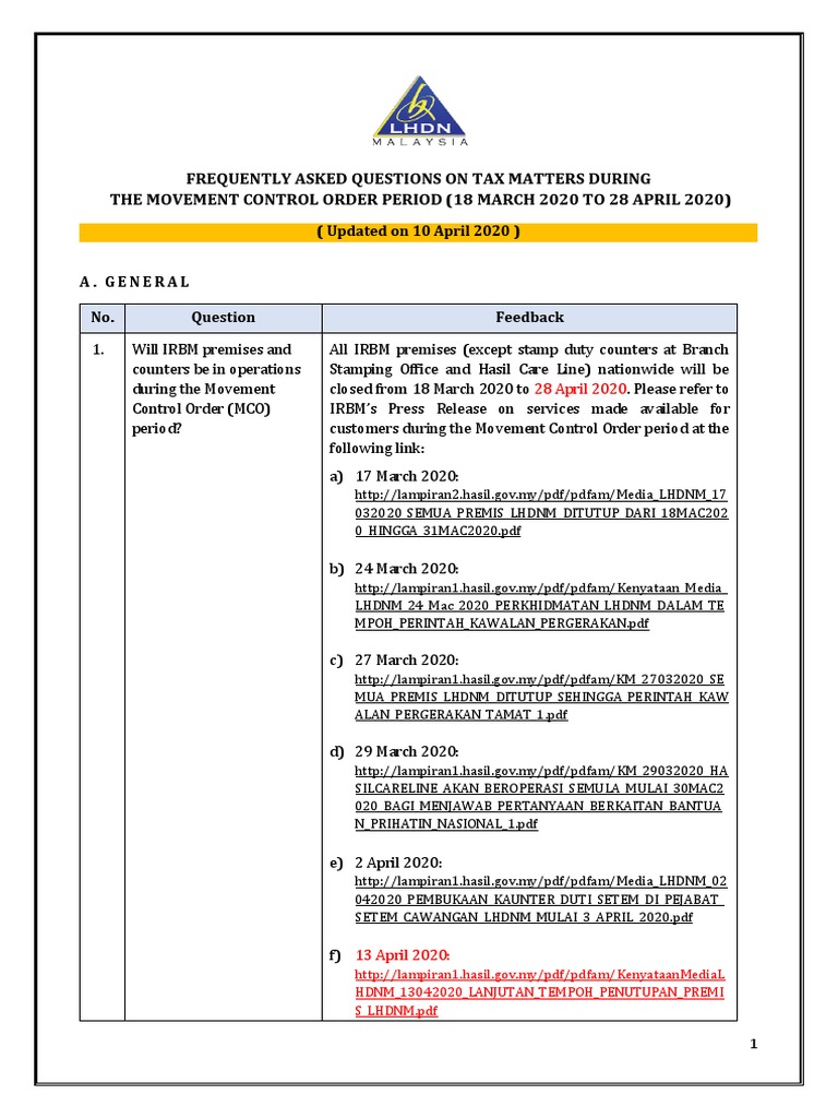 Frequently Asked Questions On Tax Matters During The Movement Control Order Period 18 March 2020 To 28 April 2020 Small And Medium Sized Enterprises Taxpayer